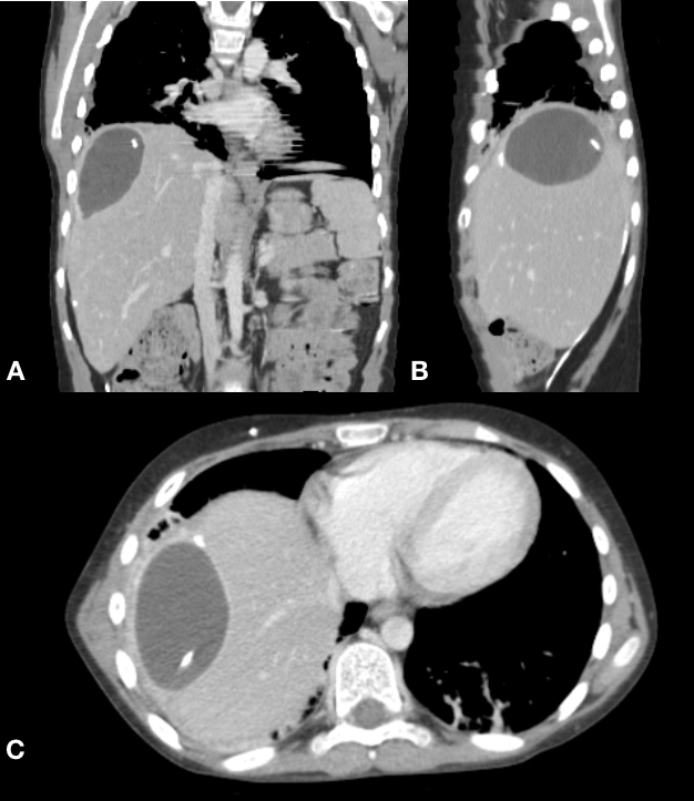 The clinical image is a computed tomography (CT) scan of the abdomen in the coronal (A), sagittal (B) and axial (C) incidences. We observe an intrahepatic (segment VII) CSF containing cyst along with the VP shunt distal tip. A 12-year-old male patient underwent a VP shunt due to hydrocephalus from tumoral etiology (craniopharyngioma). The patient had already had the shunt for 7 months when he started with severe abdominal pain on the right flank. An abdominal CT scan disclosed this rare finding. He underwent surgery to revise the shunt with repositioned towards inferior left quadrant of the abdomen. CSF analysis showed that there were no signs of infection. The patient did well without further complications. We reviewed the medical literature worldwide and found only 13 reports of intrahepatic CSF pseudocysts [1-5].