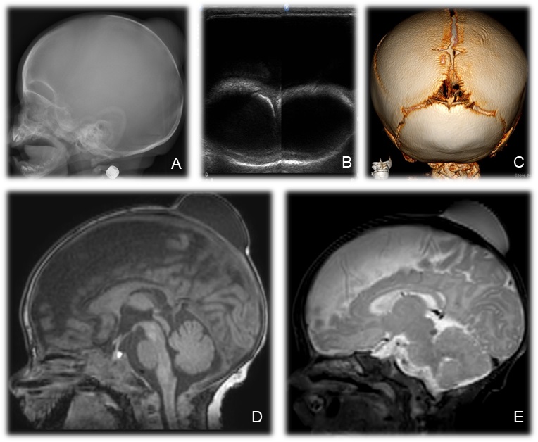For initial evaluation, skull X-ray and cerebral ultrasound were performed (Figure 1). A magnetic resonance imaging and tomography of the brain were also performed (Figure 1).