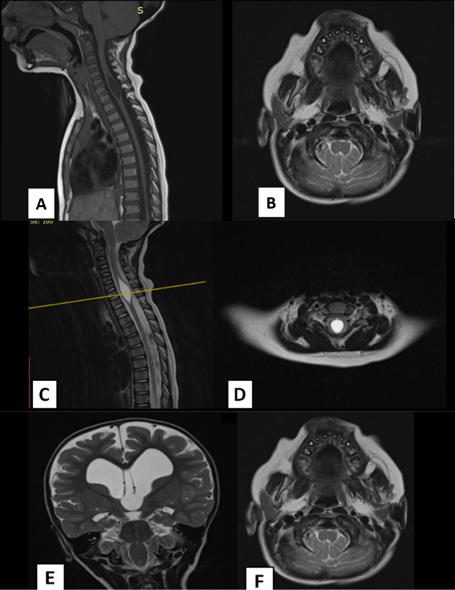 This case of a 3-year–old patient with occipital headaches, neck pain, and sleep apneas with a cervicothoracic syringohydromyelia on MRI had a complete improvement of his symptoms after a suboccipital craniectomy, removal of 2/3 of the posterior arch of C1 and release of the choroid plexus and arachnoid adhesions on the foramen of Magendie. Other anatomical variants (also seem on MRI) include tips of the obices located below normal position, increasing of the anteroposterior midsagittal distance of the spinomedullary junction and an increased angle between the clivus an the fourth ventricle (4), making a diagnosis of Chiari 0 malformation on this clinical image.