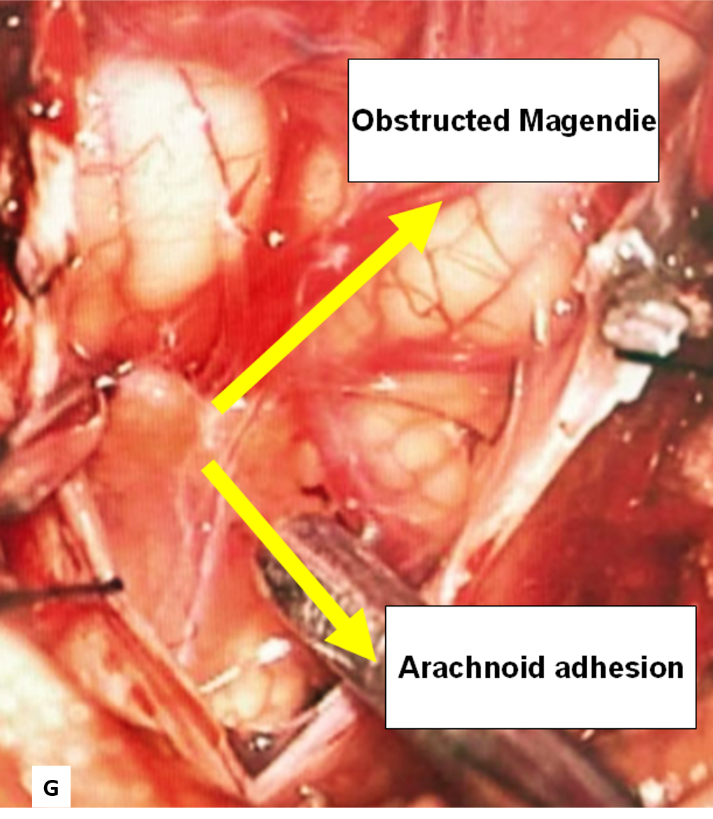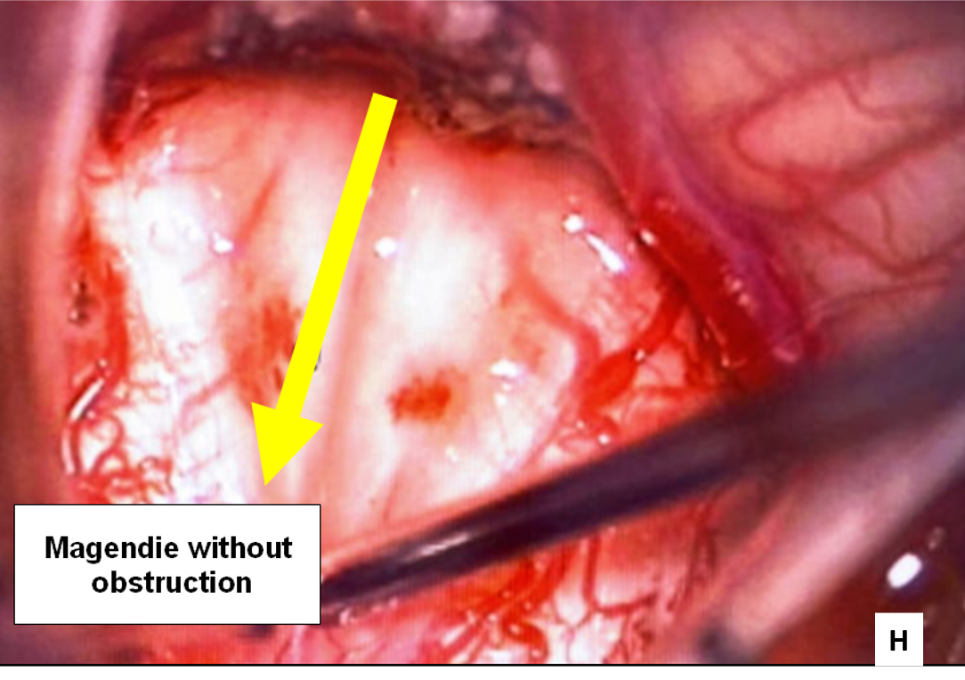 Obstructed CSF flow without tonsillar herniation could be attributable to the compactness of the posterior fossa with arachnoidal adhesions at the fourth ventricular outlet (5.)
