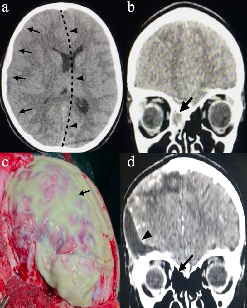 Figure 1 (a) Computed tomography of the skull, with the axial section showing a right fronto-temporo-parietal hypodense area(black arrows) with significant midline shift(black arrowheads). (b) Computed tomography of the skull, with the coronal section showing signs of sinusitis with opacification of the right ethmoid sinus(black arrow). (c) Intraoperative view after opening the dura mater showing exposure of the right fronto-temporo-parietal cortex covered by viscous purulent secretion(black arrow). (d) Computed tomography of the skull, with the coronal section showing after treatment without ethmoid opacification(black arrow) and small postoperative CSF collection(black arrowhead).